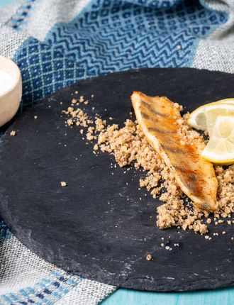 Csapósügérfilé pirított dióval, zsírban sült burgonyával és tormamártással