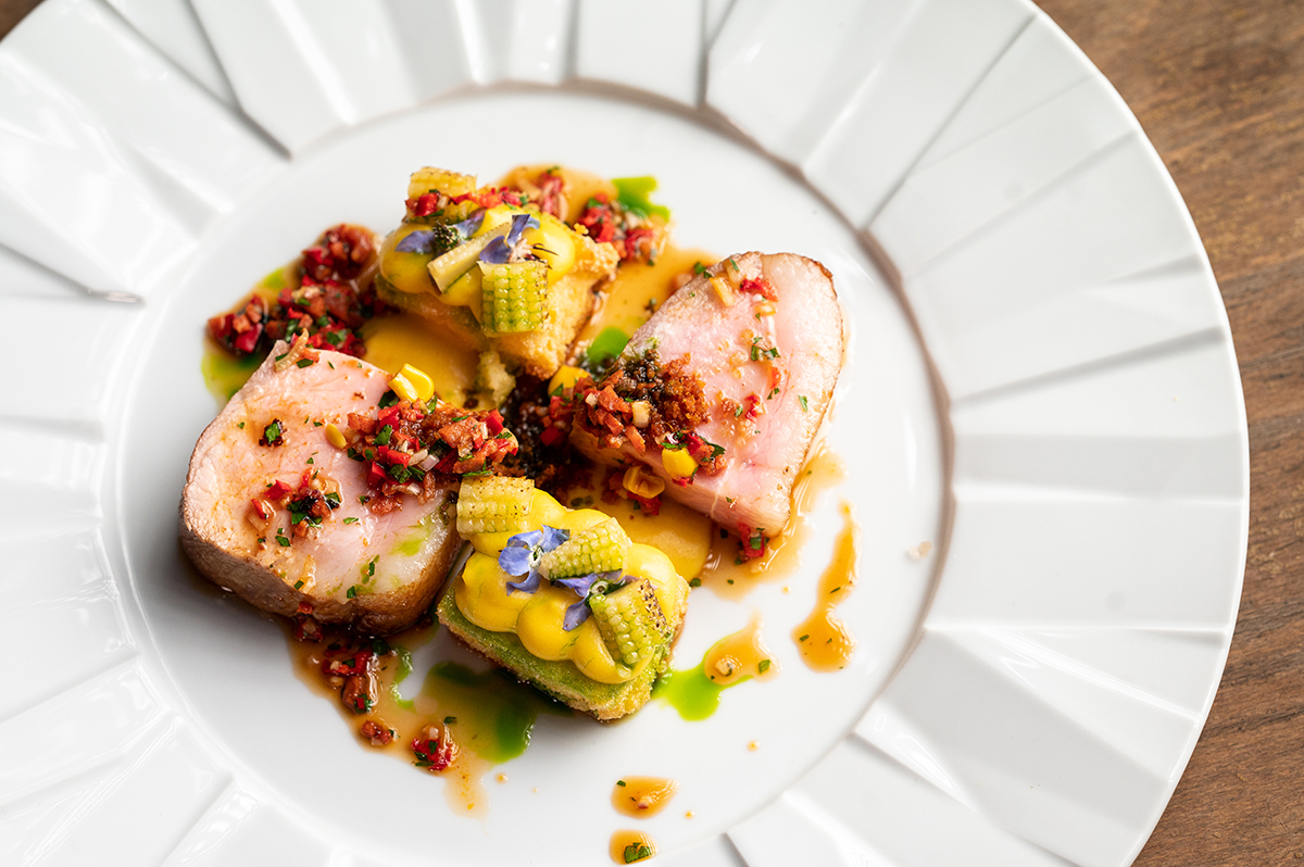 A pénteki főzések sorát Thür Ádám, a debreceni IKON étterem Michelin-ajánlásos séfje folytatta. Mint elmondta, 2018 óta dolgozik az étteremben, amelyet fine bistróként működtetnek: azaz a vidéki étkeztetésre jellemző adagokat szolgálnak fel, minőségi alapanyagokkal dolgoznak, de közben fine dining elemeket is belecsempésznek a fogásokba. Az IKON a rövid ellátási lánc mintapéldája is lehetne: az étteremnek saját kertje van, saját kertészekkel, az ültetést és a menüt összhangba hozták, így mindig friss és szezonális zöldségeket, gyümölcsöket tudnak a vendégeknek felszolgálni. A saját kertben a konyhai hulladékot is fel tudják használni, komposzt formájában. A szezonalitás jegyében Ádám idén a kukorica köré építette fel saját ételét: puliszkalisztbe hempergetett s így kisütött puliszkakockák tetejére sajtos, vajas, krémesített kukoricapüré került, mellé pedig egy kis szuvidált, körbepirított, majd kisütött mangalicakaraj. A tányérra került még savanyított, körbeperzselt bébikukorica, egy „debreceni salsa”, amibe kukorica, kápiapaprika, zöldfűszerek és debrecenipáros-kocka került. Mint a szakács mondta, az ételek kigondolásakor az vezeti, hogy nem túl sok összetevőből ízben és textúrában gazdag fogás készüljön.