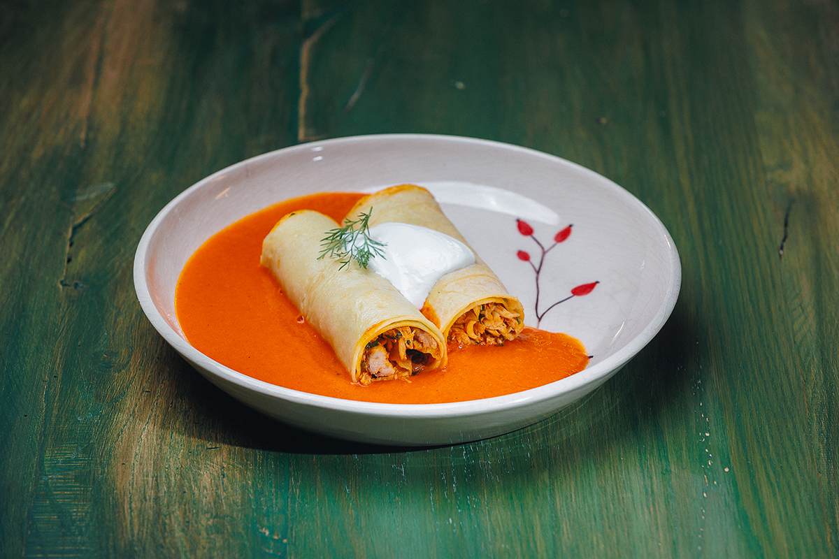 A maradék sült húsból paprikást készítünk. A szalonnát felkockázzuk, és egy öntöttvas edényben kisütjük, amíg pörcös nem lesz. Hozzáadjuk az aprított hagymát és paprikát, enyhén megsózzuk, majd addig dinszteljük, amíg pirulni kezd. Levesszük a tűzről, hozzákeverjük a fűszerpaprikát, majd kevés hideg vízzel felöntve visszatesszük főni. A maradék húst apróra vágjuk, és a pörköltalaphoz adjuk. Lassú tűzön összeforraljuk. Amíg a pörkölt fő, elkészítjük a palacsintákat. Egy keverőtálban simára keverjük a tojásokat a liszttel, tejjel és egy kevés sóval. Ha szükséges, egy kis vízzel hígítjuk. Palacsintasütőben, kevés olajon nyolc darab palacsintát sütünk. Amikor a pörkölt elkészült, megtöltjük vele a palacsintákat, majd hajtogatjuk vagy feltekerjük. Tálaláskor aláöntünk egy kevés pörköltalapot, meglocsoljuk tejföllel, és megszórjuk aprított petrezselyemzölddel.