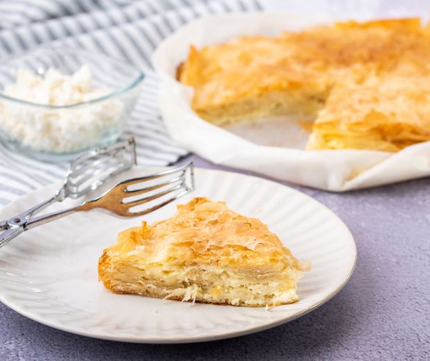 Egy kerek formát olajjal kikenünk, majd beleterítünk egy réteslapot, és ezt is megkenjük az olajjal. További két-három lapot összegyűrve ráhelyezünk, majd ismét meglocsoljuk olajjal, erre jön a töltelék fele, majd a tetejére rásimítunk két-három lapot, és olajjal megkenjük.