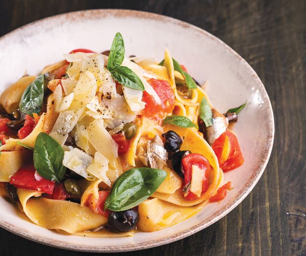 Egy nagyobb serpenyőben az olívaolajon futtassuk meg a felszeletelt fokhagymát, dobjuk rá a kapribogyót és a kissé feldarabolt olajbogyót. Pár percig forgassuk össze, majd töltsük fel a borral. Párologtassuk el a bor felét, és ekkor jöhet bele a paradicsom meg a szardella. Enyhén sózzuk meg, vigyázzunk, mert a szardella is nagyon sós. 5-6 percig rotyogtassuk a szószt, majd a végén adjuk hozzá a felvágott bazsalikomot és egy kis frissen darált fekete borst. Míg a szósz készül, egy fazékban forraljunk fel vizet, kellően sózzuk meg, és főzzük meg a széles metéltet. Amint a pasta kész, adjuk hozzá a paradicsomszószhoz, és jól keverjük össze. Ha kissé száraznak találjuk, öntsünk hozzá egy kis pastafőző levet. Nyesett parmezánnal és néhány csepp olívaolajjal tálaljuk. Jól illik hozzá az a bor, amit a főzéshez használtunk.