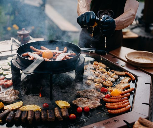 A májat alaposan lehártyázzuk, és kivágjuk a vastagabb ereket. Éles késsel 5-7 mm vastagságú szeleteket vágunk. A lila hagymát félbevágjuk, majd szeleteljük, enyhén sózzuk és egy kiskanál cukorral is összekeverjük. A vékonyra vágott szalonnát rövid idő alatt aranybarnára grillezzük. A májat közvetlenül sütés előtt sózzuk, borsozzuk és alaposan összekeverjük a zsiradékkal. 180–210 fok közötti grillre, rostlapra fektetjük, mindkét oldalán nagyjából 1-1,5 percet sütjük, majd félrehúzzuk a hőforrás egy kevésbé forró (80–100 fok) területére, ahol 3-4 percet még állni hagyjuk. A májról visszamaradt zsiradékra rádobjuk a hagymát, rövid ideig pirítjuk, ráöntjük a konyakot, és hagyjuk fellángolni. Miután szesztartalma kiégett, félrehúzzuk, friss kakukkfüvet keverünk hozzá, és hozzáadjuk a balzsamecetet is. A májjal együtt tálaljuk.