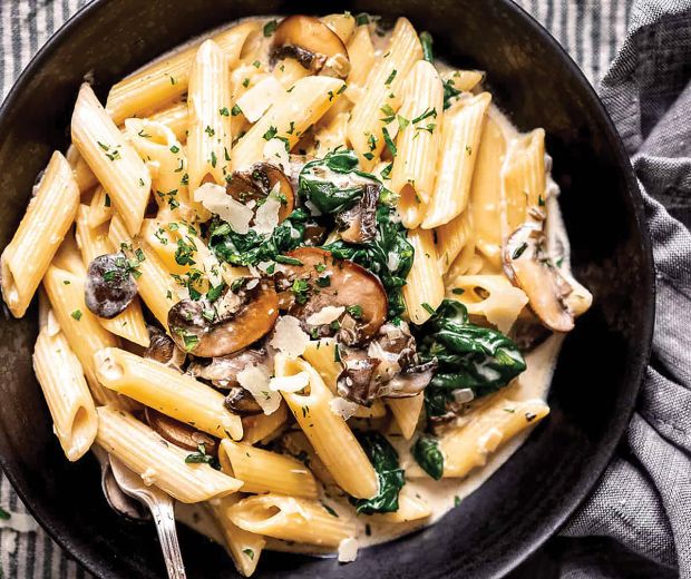 2 ek. vaj, 4 gerezd fokhagyma, 500 g gomba, 100 ml fehérbor, 1 csokor kakukkfű, 1 csokor oregánó, 800 ml tej, 500 g penne, 200 ml habtejszín, só, bors, 200 g trappista sajt.
