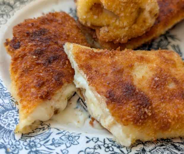 A tojásokat verjük fel, és adjuk hozzá a sót, a lisztet és apránként a tejet. Keverjük csomómentesre. Keverjük bele a 3 evőkanál olajat, majd olajjal kikent serpenyőben süssük mindkét oldalán aranybarnára. A sajtokat reszeljük le és keverjük össze egy tálban, a camembert-t szeleteljük fel. A palacsinták alsó felébe helyezzük a camembert-szeleteket, majd szórjuk rá a reszelt sajtos keveréket. Hajtsuk be a jobb, majd a bal oldalát, és tekerjük fel, mint egy burritót. A palacsintákat a szokott módon panírozzuk be, de a lisztet hagyjuk ki. Előszor tojással, végül zsemlemorzsával borítsuk be, majd forró olajban süssük aranybarnára mindkét oldalán.