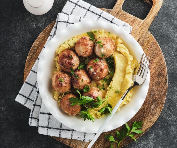 A darált húst helyezzük keverőtálba, adjuk hozzá a zsemlemorzsát, a kockákra vágott vöröshagymát, két gerezd aprított fokhagymát, majd fűszerezzük ízlés szerint sóval és borssal. Öntsük fel a masszát kevés tejjel, és dolgozzuk össze. Nem szükséges pihentetni: formázzunk kisebb golyókat belőle, ezután egy serpenyőben, kevés olajon pirítsuk le mindkét oldalukat, hogy kérget kapjanak. Készítsünk elő egy tepsit, és kenjük ki egy kevés olívaolajjal, és öntsük bele a serpenyő tartalmát az olajjal együtt. 180 fokon süssük puhára a golyókat, 20-25 perc alatt. Az elkészült húsgolyókat melegen, krumplipürével tálaljuk.