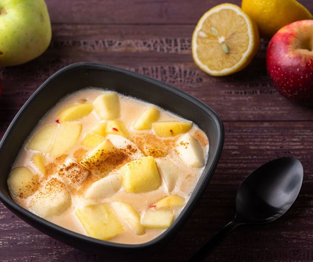 A rizst odatesszük főni kevés vízzel, majd felöntjük almalével, ízesítjük fahéjjal, a citrom héjával és levével, majd cukorral. Amint a rizs megfőtt, felöntjük tejszínnel és beletesszük a felkockázott almákat. Pár percig együtt főzzük, majd ha szükségesnek látjuk, utánízesítünk. Hidegen is kiváló.
