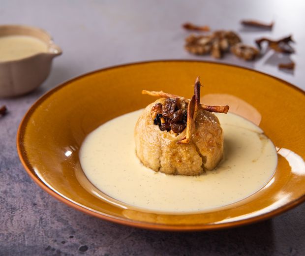 A cukorból készítsünk szirupot. Egy kis forralóban 100 ml vízzel melegítsük össze a cukrot, és addig főzzük, amíg vastag cukorszirupot nem kapunk. A meghámozott, kicsumázott almákat forgassuk a cukorszirupba, majd az alma közepét töltsük fel a diós masszával. 180 fokos sütőben 15-20 perc alatt süssük meg. Tálaláskor szórjuk meg fahéjjal, adjuk mellé a hideg vaníliaszószt.