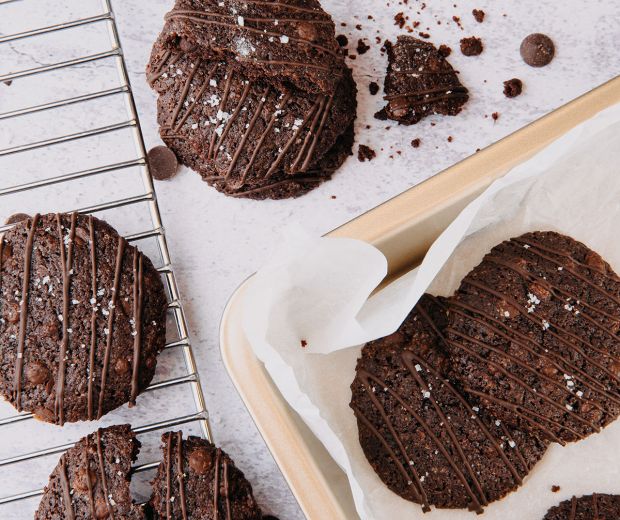 A lisztet, a kakaóport, a cukrokat és a sót elkeverjük. A vajat megolvasztjuk, majd a szoba-hőmérsékletű tojásokkal együtt habverővel összekeverjük. A tojásos-vajas masszát hozzáadjuk a lisztes keverékhez, és végül az apróra vágott csokoládét is beleforgatjuk (használhatunk csokicseppeket is). A masszából egy sütőpapírral bélelt tepsiben egy fagyiskanállal kisebb gombócokat formázunk, nem kell szétnyomni, majd sütés közben fog terülni. 170 fokos előmelegített sütőben 13–15 perc alatt (a kekszek méretétől függően) készre sütjük. Kihűlés után díszíthetjük még olvasztott csokival, illetve durva szemcséjű sóval is megszórhatjuk egy kicsit, a különlegesebb ízhatás érdekében.
