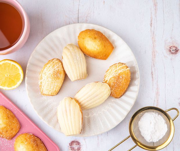 A cukrot a tojásokkal, kézi mixerrel kihabosítjuk. A lisztet a sütőporral elkeverjük, majd a tojásos masszába keverjük, és belereszeljük a citrom héját is. A kapott masszát habzsákba töltjük, és legalább egy-két órára hűtőbe tesszük. Kihűtés után a kivajazott-lisztezett formákat kb. félig megtöltjük. A sütőt a lehető legmelegebb fokozatára melegítjük elő (250–275 °C), majd ahogy betesszük a sütiket, egyből visszavesszük 210 °C-ra. Nagyjából 10 perc alatt készre sülnek, tűpróbával ellenőrizhetjük, hogy a belsejük biztosan átsült. Ha jól dolgoztunk, a sütik közepén kis csúcsok lesznek, ezt ízlés szerint krémekkel vagy lekvárokkal is tölthetjük. Ebben az esetben egy fehércsoki-réteg kerül a sütikre. A fehér csokit felolvasztjuk, majd amikor 34-36 fokosra hűlt, belekeverjük a porított kakaóvajat, majd tovább kevergetjük, amíg visszahűl 29 fokosra, ekkor a formák alját kikenjük a csokival, és egy-egy madeleine-t nyomunk bele. Hűtőbe tesszük, amíg megköt, és szépen ki tudjuk venni a formából.
