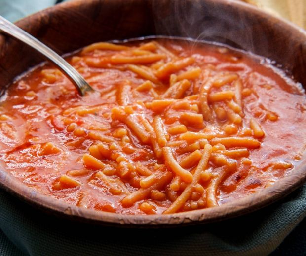 A megtisztított paradicsomot és hagymát vágjuk félbe és helyezzük turmixgépbe. Ezután adjuk a zöldségekhez a fokhagymát és a vizet, majd az egészet turmixoljuk simára. Egy magas falú edényben forrósítsunk kevés olajat, majd dobjuk rá a tésztát, és pirítsuk 1-2 percig, közben kevergessük. Ezután öntsük a tésztára a leturmixolt paradicsomot. A levest fűszerezzük sóval, borssal, római köménnyel és chilivel. Főzzük 10-15 percig, amíg az ízek összeérnek és a tészta megpuhul. Ha szükségesnek érezzük, öntsünk még hozzá vizet. Finomra aprított korianderrel vagy petrezselyemmel megszórva kínáljuk.