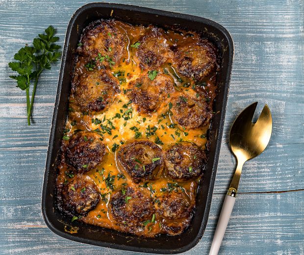 A közepes hagymákat megpucoljuk és a felső feléből levágunk egy keveset. A hagymákat olívaolajjal megkenjük, tűzálló edényben egymáshoz szorosan tesszük, megszórjuk egy kis sóval, majd 200 Celsius-fokos hőmérsékletű sütőben negyven percig sütjük. Fontos, hogy a hagymák teteje enyhén megkaramellizálódjon, hogy szemnek és szájnak is gyönyörködtető legyen. Ezalatt egy forralóedényben a vajat, a bort, a tejszínt és a felaprított fokhagymát összefőzzük. Enyhén sózzuk és borsozzuk, majd hozzákeverjük a parmezán felét. Ha megsültek a hagymák, akkor ráöntjük ezt a tejszínes keveréket, és megszórjuk a maradék reszelt parmezánnal. Visszatesszük a sütőbe, és fél óra alatt aranybarnára sütjük. Ha kész van, valamilyen hidegen sajtolt olajjal meglocsoljuk, petrezselyemzölddel megszórjuk, és így tálaljuk. Bármilyen sült mellé körítésként fogyasztható, az elkészítése nagyon egyszerű, a végeredmény pedig biztosan elviszi a pálmát.