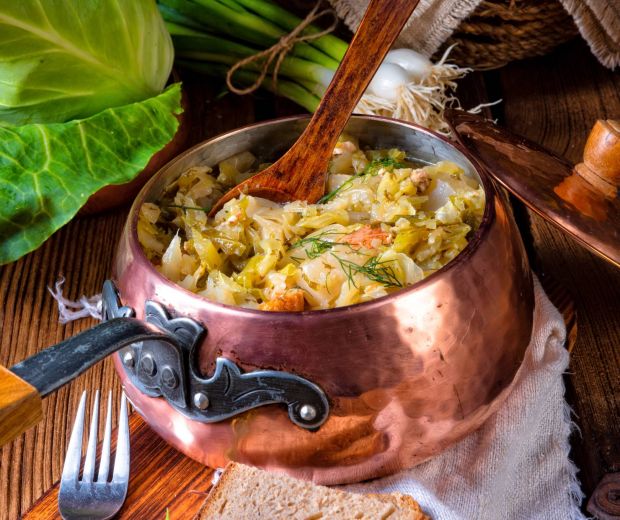 A káposztát szeleteljük fel vékonyra, majd tegyük egy közepes lábasba. Öntsük rá a vizet, adjuk hozzá a sót, a kétféle borsot, és főzzük közepes lángon körülbelül 5-10 percig, amíg a káposzta kissé megpuhul. Ezután öntsük hozzá az ecetet, keverjük össze és tegyük félre. A bacont vágjuk apró darabokra, pirítsuk meg, majd amikor már szépen barnul, adjuk hozzá az apróra vágott hagymát és pirítsuk tovább, amíg aranybarna nem lesz. A hagymás bacont öntsük a káposztához, a visszamaradt zsírt pedig hagyjuk a serpenyőben. Olvasszuk fel rajta a vajat, adjuk hozzá a lisztet és kevergessük 1 percig, amíg világos rántást nem kapunk, majd ezt is adjuk a káposztához. Tegyük vissza a lábast kis lángra, és főzzük fedő nélkül addig, amíg a leve részben elpárolog és a káposzta besűrűsödik (10-15 perc). Friss kaporral megszórva tálaljuk.