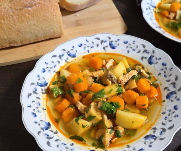 A húst tisztítsuk meg és daraboljuk fel tetszés szerint. A zöldségeket is tisztítsuk meg, és daraboljuk fel tetszés szerint, a hagymát vágjuk finomra. A gombát is tisztítsuk meg, daraboljuk fel tetszés szerint. Egy magas falú edényben hevítsünk zsírt, majd dobjuk rá a hagymát és dinszteljük üvegesre. Ezután keverjük hozzá a fűszerpaprikát és a húst, pirítsuk 10-15 percig, közben fűszerezzük sóval és borssal, ha szükséges, adjunk hozzá egy kis vizet. Az előkészített zöldségeket és a gombát keverjük a húshoz, és öntsük fel annyi vízzel, amennyi ellepi, közben fűszerezzük tárkonnyal. Főzzük addig, amíg a zöldségek és a gomba is megpuhulnak. Petrezselyemzölddel megszórva kínáljuk.
