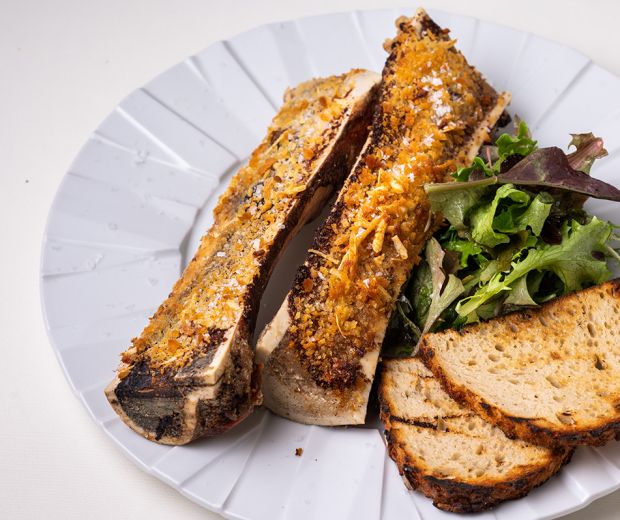 A sütőt 200 Celsius-fokra előmelegítjük. A csontokat vágott felükkel felfelé sütőtálcára tesszük. A fokhagymát fokhagymatörővel összezúzzuk, majd az olajjal összekeverjük. A pankomorzsát az érlelt sajttal összekeverjük. A csontokat a fokhagymás olajjal megkenjük, majd púposan rászórjuk az érlelt sajtos morzsát. Előmelegített sütőben 15-20 perc alatt készre sütjük. Akkor van készen, amikor a velő színt vált, és már fő a csontban. Sóval megszórva, pirítóssal tálaljuk.