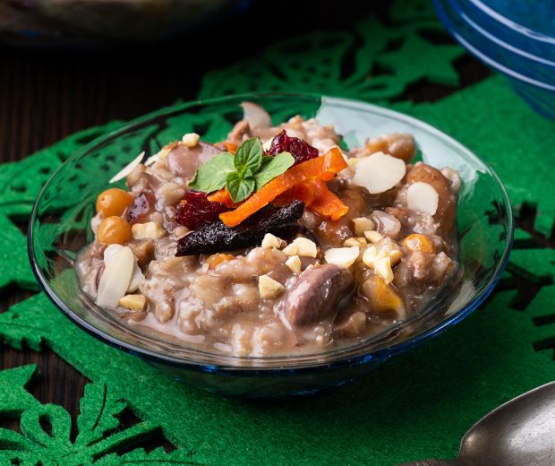 Az aszalt gyümölcsöket pár órára vízbe áztatjuk, a fahéjat meg a szegfűszeget 3 deci vízben felfőzzük, majd leszűrjük. A beáztatott anyagokat a dióval, mandulával, fűszeres lével, picit sózva, fél órát főzzük. Beletesszük a zabpelyhet, és ennek elkészüléséig fazakunk tartalmát lassan rotyogtatjuk. Továbbá cukorral, vaníliás cukorral, mézzel és reszelt citromhéjjal ízesíthetjük.