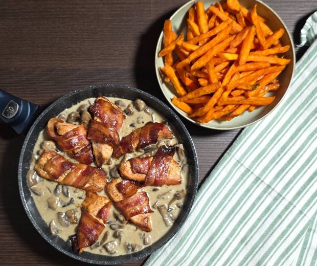A gombát tisztítsuk meg és vágjuk fel tetszés szerint. A csirkemellet vágjuk csíkokra, majd tekerjük körbe baconnel. Egy serpenyőben forrósítsunk leheletnyi olajat, majd helyezzük bele a baconnel körbetekert húst és pirítsuk készre. Az elkészült húst szedjük tányérra és tegyük félre. Az előkészített gombákat dobjuk abba a serpenyőbe, amelyben a hús sült, és pirítsuk meg, közben fűszerezzük sóval, borssal. Ezután öntsük fel tejszínnel, helyezzük bele a baconnel körbetekert húst és főzzük rottyanásig. Rizzsel, tésztával vagy krumplival kínáljuk.
