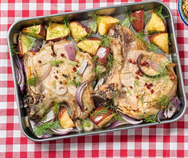 Az olajat keverjük össze a fokhagymával, mustárral, sóval és borssal. Ezután forgassuk bele a sertésszeletet, és lefedve tegyük hűtőbe 30 percre, de egy éjszakát is pihenhet így a hús. A krumplit és a lila hagymát pucoljuk meg, majd vágjuk fel tetszés szerint. Egy tepsit kenjük ki vékonyan olajjal, majd tegyük rá a krumplit és a hagymát, és forgassuk egybe sóval és borssal. Ezután a hússzeleteket helyezzük a burgonyára. A tálban maradt pácot kanalazzuk a húsra és a krumplira. A tepsit toljuk 180 fokosra előmelegített sütőbe, és 45-50 perc alatt süssük készre.