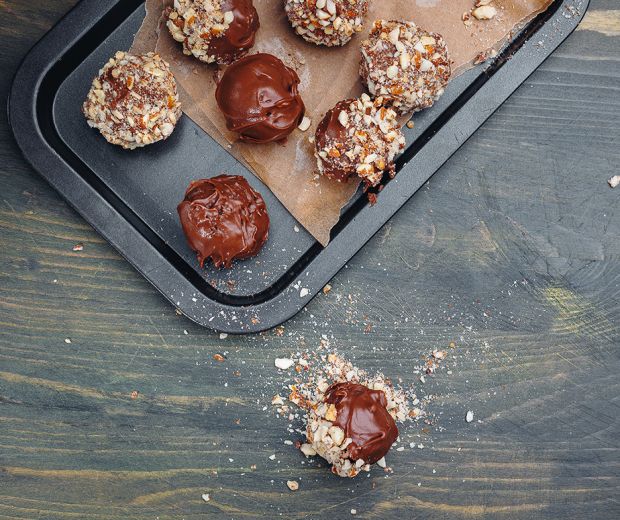 Ünnepek után különösen jó ötlet ez a desszert, hiszen így kreatívan felhasználhatjuk a megmaradt, kissé szikkadt diós bejglit. A bejglit egy keverőtálba morzsoljuk, hozzáadjuk a baracklekvárt, és alaposan összegyúrjuk. A masszából kis golyókat formázunk, és hűtőbe tesszük 10-15 percre, hogy kissé megdermedjenek. Közben a csokit és a vajat gőz fölött összeolvasztjuk. A bejgligolyókat nyárspálcikára szúrjuk, majd egyenként belemártjuk az olvasztott csokiba. Ezután meghempergetjük a durvára tört dióban vagy mandulában. A kész bonbonokat sütőpapírral bélelt tálcára tesszük, és néhány percre hűtőbe rakjuk, hogy megdermedjenek. Reggeli kávé mellé vagy vendégváró falatként is remekül megállja a helyét.