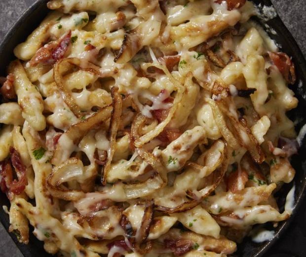 A nokedlihez keverjük össze a tojást, sót, lisztet és a vizet. A massza sűrű, de lágy legyen, majd nokedliszaggatóval szaggassuk forrásban lévő vízbe. Amikor a galuskák a víz felszínére úsztak, várjunk még néhány percet, majd szűrjük le. A szalonnát ízlés szerint kockázzuk fel, majd saját zsírján pirítsuk le (ha szükséges, tegyünk alá kevés zsiradékot). A hagymát tisztítsuk meg, vágjuk apróra, majd abban a serpenyőben, amelyben a szalonna sült, pirítsuk le, közben fűszerezzük sóval és borssal. A nokedlit forgassuk egybe a pirult szalonnával és a hagymával, majd öntsük hőálló edénybe, és szórjuk meg reszelt sajttal. Ezután toljuk 180 fokosra előmelegített sütőbe, és 10-20 perc alatt süssük készre.