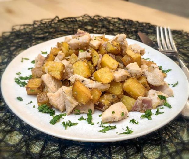 A hagymákat tisztítsuk meg, a krumplit mossuk meg héjastól, majd kockázzuk fel mindet, és tegyük félre. A csirkemellet vágjuk fel kisebb csíkokra, a szalonnát kockázzuk fel. Egy nagy serpenyőben hevítsük fel az olajat, és pirítsuk le benne pár perc alatt a szalonnakockákat. Szedjük ki a serpenyőből, majd a visszamaradt zsiradékon dinszteljük meg a vöröshagymát. Amikor üveges, adjuk hozzá a csirkemellcsíkokat. Ízlés szerint sózzuk és borsozzuk, és adjuk hozzá a fokhagymát is. Pirítsuk, amíg a csirkemellfalatok enyhén megpirulnak. Öntsünk alá 1 dl vizet, majd főzzük tovább kb. 5 percig, végül zárjuk el a lángot. A felkockázott krumplihoz melegítsünk fel annyi olajat, amennyiben kényelmesen meg tudjuk azt sütni (kb. 0,5 liter). Amint szépen megpirultak, szedjük papírtörlőre, majd ha lecsepegett róla a felesleges olaj, adjuk hozzá a kész csirkés brassóialaphoz a félretett szalonnával együtt, és forgassuk össze. Melegítsük 2-3 percig, majd már tálalhatjuk is.