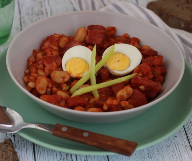 A hagymát, a fokhagymát meghámozzuk, felaprítjuk. A tarját nagyobb kockára vágjuk, sózzuk, borsozzuk, és az olajon forró serpenyőben körbe pirítjuk, majd kiszedjük és félretesszük. A visszamaradt szafton megsütjük a felaprított hagymákat, sózzuk, borsozzuk, megszórjuk borssal, köménnyel, fűszerpaprikával, rátesszük a sült tarját, a lecsöpögtetett babot, babérlevelet, hozzáforgatjuk a darabolt paradicsomot, majd felöntjük a vízzel. Felforraljuk, és kb. 15-20 perc alatt készre főzzük. A ragut csípőspaprikával és friss kenyérrel tálaljuk.