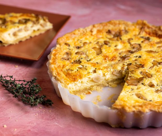 A tésztához egy keverőtálban morzsoljuk el a vajat a liszttel, sózzuk meg, majd fokozatosan keverjük hozzá a tejet. Csomagoljuk fóliába és hagyjuk pihenni egy kis ideig. Amíg a tészta pihen, készítsük el a fokhagymás tölteléket. Egy kisebb forralóban tegyünk fel vizet főni a fokhagymával együtt. Főzzük három-négy percig, majd csöpögtessük le alaposan. Töröljük szárazra a forralót, töltsük bele az olívaolajat és adjuk hozzá a fokhagymát. Pirítsuk körbe a cikkeket, majd öntsük hozzá a balzsamecetet, két-három kanál vizet, és jöhet bele cukor, az apróra vágott kakukkfű és rozmaring. Főzzük addig, amíg a víz el nem párolog, és a fokhagymákat sötét karamell nem vonja be. Tegyük félre. A tésztát sodrófával nyújtsuk ki akkorára, hogy betakarja a piteformát. Béleljük ki a formát a tésztával. Figyeljünk arra, hogy a tészta kissé túllógjon a forma szélein. Vágjunk sütőpapírból egy kört, tegyük a formába, és öntsünk bele pénzérméket vagy száraz babot. Tegyük a formát 180 fokosra előmelegített sütőbe 20 percre. Ezt a folyamatot hívjuk vakon sütésnek. A 20 perc leteltével vegyük ki a „nehezéket” a formából (ezt tegyük félre későbbi felhasználásra), majd a tésztát tegyük vissza még 5 percre sülni. Amíg a tészta sül, készítsük el a szószt. Egy keverőtálba verjük fel a tojásokat, adjuk hozzá a tejszínt. Ízlés szerint fűszerezzük sóval, frissen darált fekete borssal. Az elősütött forma aljára szórjuk rá a lereszelt sajtot, töltsük bele a tejszínes szószt, majd szórjuk a tetejére a karamellizált fokhagymát. 160 fokosra előmelegített sütőben süssük 40-45 percig. Amint kész, vegyük ki a sütőből, hagyjuk kissé kihűlni, majd szeleteljük fel és tálaljuk. Melegen a legjobb, de hidegen is fogyasztható. Jól illik hozzá egy könnyed száraz fehérbor.