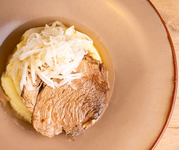 Egy vastag falú öntöttvas lábasban hevítsünk fel egy evőkanál sertészsírt, majd pirítsuk körbe a sertéscombot. Töltsük bele a bort, majd egy kis idő múlva a maradék zsírt is adjuk hozzá. Félig el kell lepje. Nagyon alacsony tűzön, épp csak gyöngyözzön, két óra alatt abáljuk készre. Mialatt a comb készül, készítsük el a krumplipürét. Ha lehetséges, szerezzünk be lisztes fajta krumplit. Ez besorolás szerint a C kategóriába tartozik. A krumplikat hámozzuk meg, vágjuk nagyobb hasábokra, és kellően sós vízben főzzük meg. Szűrjük le, és hagyjuk gőzölögni egy kis ideig, így további víz távozik belőle, majd adjuk hozzá a felkockázott hideg vajat, és krumplitörővel dolgozzuk krémesre. Ha szükségesnek látjuk, adjuk hozzá fokozatosan a felforrósított tejet. Használjunk habverőt. Ha kell, sózzunk utána. Amint a comb elkészült, szedjük ki egy lapítóra, a visszamaradó zsírba tegyük bele a felaprított fokhagymát. Az elkészült combot szeleteljük fel, majd tegyük vissza a fokhagymás zsírba. Hagyjuk állni a forró zsírban egy kis ideig, majd tálaljuk a krumplipürével és savanyú káposztával. Mindenképp locsoljuk meg egy kis sült zsírral.