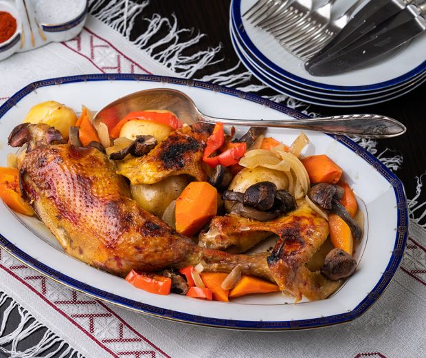 A húst sózzuk, borsozzuk meg, majd fektessük egy zsiradékkal kikent tepsibe, a bőrös oldalukkal felfelé. A feldarabolt zöldségeket szórjuk a hús köré, ezeket is sózva, borsozva. A mézet keverjük össze a paradicsomlével, kenjük át vele a húsokat. Öntsük a bort a tepsibe, fedjük le alufóliával, és süssük a hús puhulásáig. Az alufólia levétele után pirítsuk pirosra a kakashúst úgy, hogy közben többször kenjük át a maradék mézes-paradicsomos keverékkel.