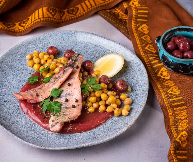 Meggylében párolt fogasfilé, pirított csicseriborsóval és citromos meggyszósszal