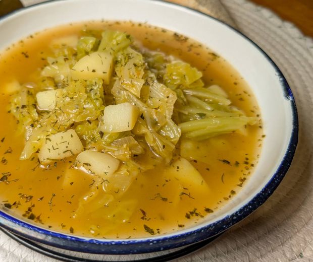 A vöröshagymát vágjuk apróra, a fokhagymát zúzzuk össze. A krumplit pucoljuk meg, és kockázzuk fel, a kelkáposztát rusztikusan daraboljuk fel. Hevítsünk olajat, szórjuk rá a hagymákat, és pároljuk 3-4 percig. Adjuk hozzá a fűszerpaprikát és a köményt, majd öntsünk rá annyi vizet, hogy ellepje, pároljuk így pár percig. Szórjuk rá a krumplit, és öntsük fel alaplével, sózzuk, borsozzuk, főzzük 10 percig. Ha a krumpli már elkezd puhulni, adjuk hozzá a feldarabolt kelkáposztát és a zöldfűszereket. Főzzük tovább 5-10 percig. Fontos, hogy ne főzzük szét a leveleket. A keményítőt keverjük csomómentesre egy merőkanál levessel, majd öntsük vissza, és főzzük tovább 1-2 percig.