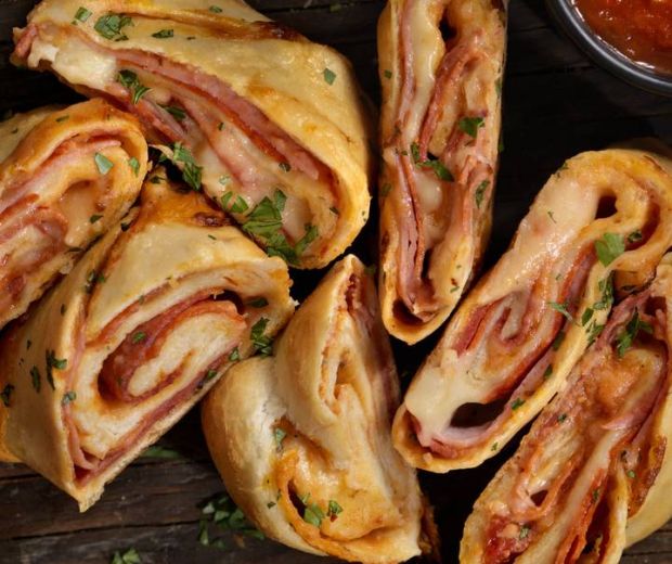 A leveles tésztát nyújtsuk vagy tekerjük ki. Ezután kenjük meg a paradicsompürével vagy pizzaszósszal, majd helyezzük rá a sonkát, és szórjuk meg a reszelt sajtokkal. A tésztát tekerjük fel, majd vágjuk kétujjnyi vastagságúra. A kis csomagokat helyezzük sütőpapírral bélelt tepsire, majd a tészta tetejét kenjük meg felvert tojással, és ha szeretnénk, szórjuk meg reszelt sajttal. Toljuk 180 fokosra előmelegített sütőbe, és süssük készre kb. 15-25 perc alatt.