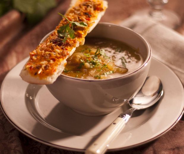 A fűszervajhoz a paprikát megmossuk, húsát apróra vágjuk. A vajat habosra keverjük a paprikával, fűszerpaprikával, citromlével, snidlinggel, sózzuk, borsozzuk, és fél órára a hűtőbe tesszük. A leveshez a hagymákat és a fokhagymát megtisztítjuk, vékony karikára vágjuk. Egy edényben a vajat felolvasztjuk, barnára melegítjük, hozzáadjuk a cukrot, enyhén karamellizáljuk, majd rádobjuk a hagymát, és enyhe tűzön megpároljuk. Hozzáadjuk a fehérborecetet és a tárkonyt, tovább pároljuk, majd felöntjük a zöldséglevessel. Egyet forralunk rajta. A bagettet felszeleteljük, 4 belső szeletet a serpenyőben visszamaradt zsiradékon kissé megpirítunk, majd megkenjük a paprikás fűszervajjal, és a forró levessel tálaljuk.