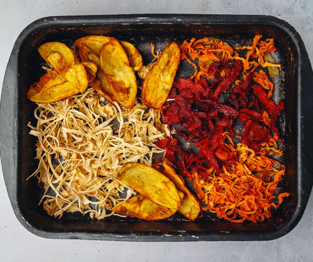 Ez valójában nem is nevezhető receptnek, hiszen első látásra nincs benne semmi kihívás. Mégis fontos, hiszen az egyik legpraktikusabb felhasználása a különben kukába kerülő héjaknak. Lehet vegyesen csinálni, de el lehet külön-külön is készíteni. A lényeg, hogy a krumpli- és céklahéjat olajban süssük meg, a többi zöldség héját 80 fokos, légkeveréses sütőben, mint egy aszalóban, pár óra alatt szárítsuk ki. Gyorsítja a folyamatot, ha a sütőt fél centiméter résznyire ki tudjuk támasztani, hogy a keletkező gőz távozni tudjon. A végeredmény önmagában is fogyasztható, de lehet belőle készíteni száraz fűszerkeveréket vagy akár fűszerport is.