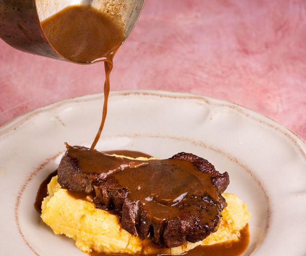 A báránycombot nagyobb kockákra vágjuk. Egy öntöttvas lábast felhevítünk, majd a sertészsíron szépen körbepirítjuk a húskockákat. Dolgozzunk részletekben, ne zsúfoljuk túl a lábast. Amint a pirítással végeztünk, a visszamaradt zsírra dobjuk rá a felaprított hagymát, kissé sózzuk meg, kavargassuk, míg üveges nem lesz. Ezután adjuk hozzá a felkockázott murkot, zellerszárat, fokhagymát, keverjük a zöldségek közé a paradicsompasztát, majd öntsük fel a vörösborral és a konyakkal. Fűszerezzük sóval, frissen darált fekete borssal, köménnyel, rozmaringgal és babérlevéllel. Reszeljük rá egy citrom héját, és ízlés szerint egy kis levet is adhatunk hozzá. Tegyük vissza a lábasba az előpirított bárányt, keverjük össze, fedjük le, és 120 fokra előmelegített sütőben 3-4 óra alatt készítsük el. Egy szép fej fokhagyma tetejét vágjuk le, kissé sózzuk meg, csomagoljuk alumíniumfóliába, és tegyük be sülni a sütőbe, a lábas mellé. Amint a fokhagyma megpuhult, vegyük ki. Hagyjuk kihűlni, majd pucoljuk meg, vagy ki is nyomhatjuk a kezünkkel. Mihelyt a bárány elkészült, szűrjük le a szószt, keverjük bele a sült fokhagymát, folyamatos kevergetés mellett a hűtőhideg vajat. Ha szükségesnek látjuk, sűrítsük be egy kis kukoricakeményítővel. A bárányhúsokat krémes puliszkával és a sült fokhagymás szósszal tálaljuk.