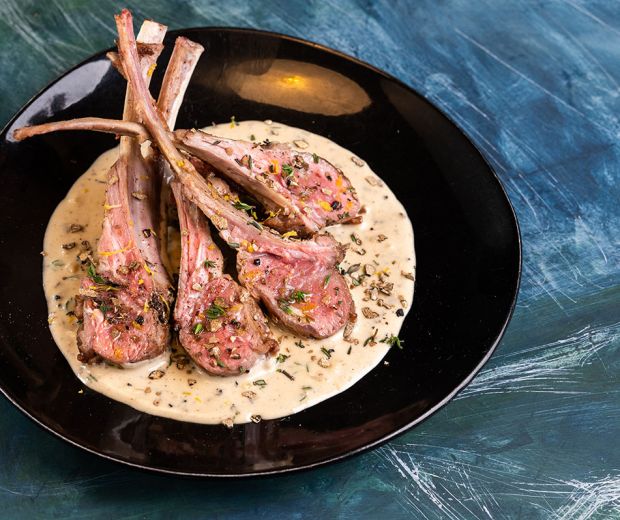 A csontos báránykarajt sózzuk, borsozzuk, majd a sertészsíron pirítsuk körbe egy öntöttvas serpenyőben. Ízletesebb lesz a hús, ha egy éjszakára 3%-os sóoldatba pácoljuk (1 liter víz, 30 g só), ebben az esetben sütéskor nem kell sózni, csak borsozni. Amint a sütéssel megvagyunk, tegyük félre pihenni legalább 5 percre. A báránykarajt médiumon kell fogyasztani, ellenkező esetben nagyon kiszárad. Aki jól átsütve szereti, süsse tovább a serpenyőben. A visszamaradt zsíron pirítsuk meg a felaprított fokhagymát, majd öntsük fel a borral. Párologtassuk el a bor nagy részét, majd adjuk hozzá a mustárt, a kakukkfüvet és a főzőtejszínt. Ízlés szerint fűszerezzük sóval, borssal. Főzzük addig, amíg kellő állagú nem lesz. A végén reszeljünk a szószba citromhéjat, és állítsuk be a savasságát ízlés szerint citromlével. A karajokat krumplipürével és mustáros szósszal tálaljuk.