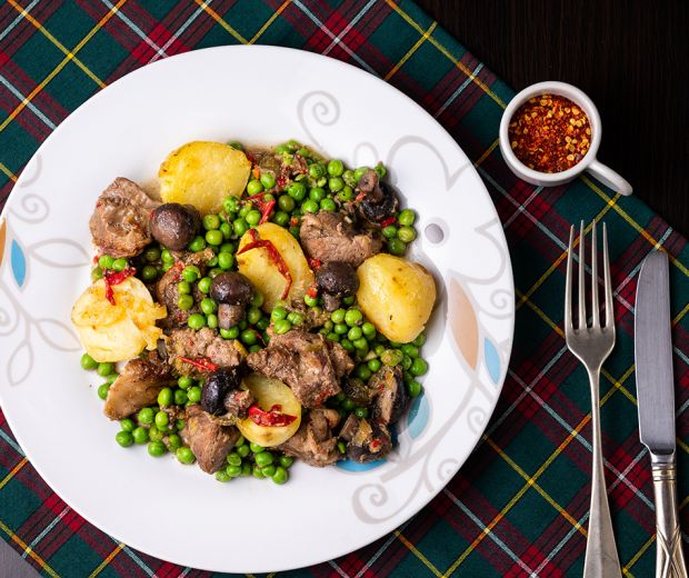 A húst nagyobbacska kockákra vágjuk, a többi zöldséget is feldaraboljuk. A vajon átpirítjuk őket, fűszerezzük, és edényünket a sütőbe toljuk. A sütés vége felé a zöldborsót is beleszórjuk. Mondhatni, e változatnak már nem volt ideje a hűtőben pironkodni.