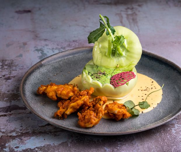 Papsajtkrémleves citromvajas süllőkockákkal karalábékehelyben tálalva
