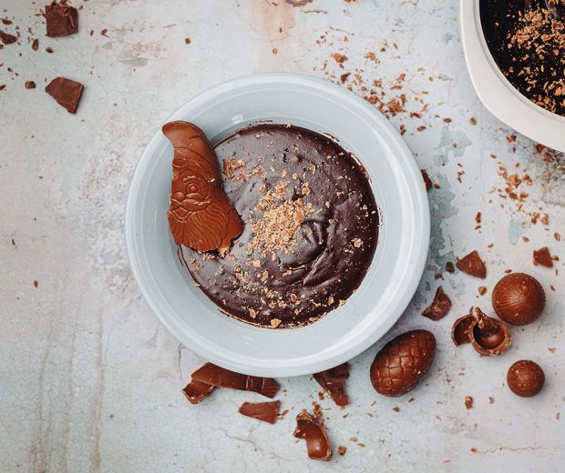 A húsvétról megmaradt nyuszi- és tojáscsokit – és más csokimaradékokat is – remekül felhasználhatjuk ebben a receptben. Ráadásul a gyerekek egyik nagy kedvence. Egy inox keverőtálba beletördeljük a csokoládét, majd forró gőz felett, a vajjal együtt megolvasztjuk. Amint felolvadt, folyamatos kavarás mellett hozzá­adjuk a kakaóport és a porcukrot, majd simára keverjük. Egy kevés tejben elkeverjük a kukoricakeményítőt, és a többi tejjel együtt a csokis masszához adjuk. Felfőzzük, majd kis tálkákba adagolva kihűtjük. Egyszerű, de nagyszerű desszert!