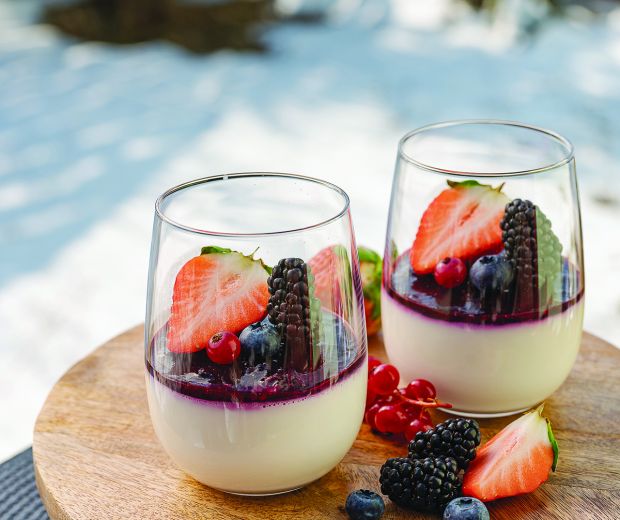 A zselatinlapokat jeges vízbe áztatjuk. A tejet a tejszínnel, a vaníliarúd kikapart magjaival és a cukorral forrásig melegítjük, ezután feloldjuk benne a kinyomkodott zselatinlapokat. Folyamatos kevergetés mellett egy kicsit visszahűtjük a tejes keveréket, poharakba töltjük, és egy éjszakára a hűtőbe tesszük. Másnap reggel a gyümölcsöket a cukorral addig főzzük, míg a cukor teljesen fel nem olvad, és a gyümölcsök meg nem puhulnak, aztán feloldjuk benne a beáztatott zselatinlapokat, és leturmixoljuk, majd a megszilárdult tejszínes alap tetejére öntjük.