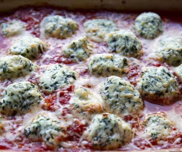 A spenótot tisztítsuk meg, majd vágjuk apróra (ha fagyasztott, olvasszuk ki). Egy tálban keverjük össze a ricottát, a spenótot, a tojást, a reszelt sajtot és a zsemlemorzsát. Sóval, borssal ízesítsük. A masszából formázzunk kisebb golyókat. A mártáshoz öntsük a darabolt paradicsomot egy magas falú tepsibe, adjuk hozzá az olívaolajat, a reszelt fokhagymát, ízesítsük sóval, borssal, oregánóval, és alaposan keverjük össze. A golyókat helyezzük a szószba. 180 fokosra előmelegített sütőben süssük 25-30 percig. Tésztával tálaljuk.