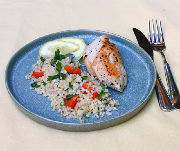 A csirkemelleket vágjuk ízlés szerinti vastagságúra, majd sózzuk és borsozzuk meg. Egy közepes méretű serpenyőben melegítsük fel az olajat, majd süssük benne aranybarnára a csirkemelleket közepes lángon, oldalanként kb. 5-6 perc alatt (ez nagyban függ a hús vastagságától is, lehet ennél kevesebb vagy több is). A kész húst hagyjuk a serpenyőben, fedő alatt, hogy ne hűljön ki. A bulgurt tegyük egy kisebb vagy közepes méretű lábasba, alaposan mossuk át, csepegtessük le, majd öntsünk rá kb. 1-1,5 dl forró vizet. Hagyjuk állni, hogy a bulgur magába tudja szívni a vizet. A koktélparadicsomokat mossuk meg, majd vágjuk félbe vagy negyedekbe, és adjuk hozzá a kész bulgurhoz. Csepegtessük rá a citrom levét is, illetve a friss, aprított petrezselymet is adjuk hozzá, és finoman forgassuk össze az egészet. Együtt, melegen tálaljuk.
