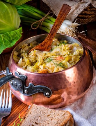 A káposztát lesarvaljuk, enyhén megsózzuk, majd a sertészsíron megdinszteljük, hagyjuk, hogy szépen megbarnuljon, karamellizálódjon. A végén kellően borsozzuk.
