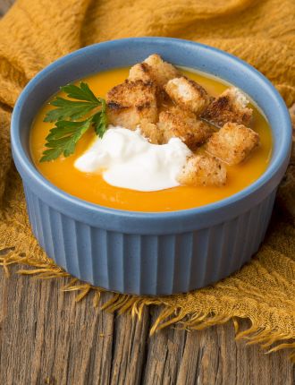 A zöldségeket mossuk meg, pucoljuk meg. A sütőtököt, a paprikákat és a lila hagymát vágjuk félbe, ahol szükséges, a magokat távolítsuk el. A fokhagymafej tetejét vágjuk le, hogy látszódjanak a gerezdek. Tegyük őket egy tepsibe, majd 180 fokon, légkeverésen 45-50 perc alatt süssük készre. A sült zöldségeket tegyük egy turmixgépbe, a fokhagymafejből nyomjuk ki a gerezdeket. Adjunk hozzá egy kis vizet, friss bazsalikomot, sózzuk, borsozzuk, ezután dolgozzuk pépes állagúra. A püréhez adjuk hozzá a kókusztejet, így elérve a krémes állagot. Friss bazsalikommal és pirított kenyérkockákkal tálaljuk.