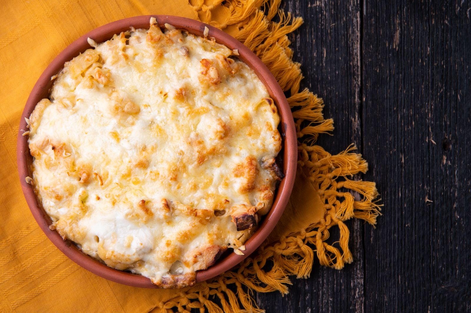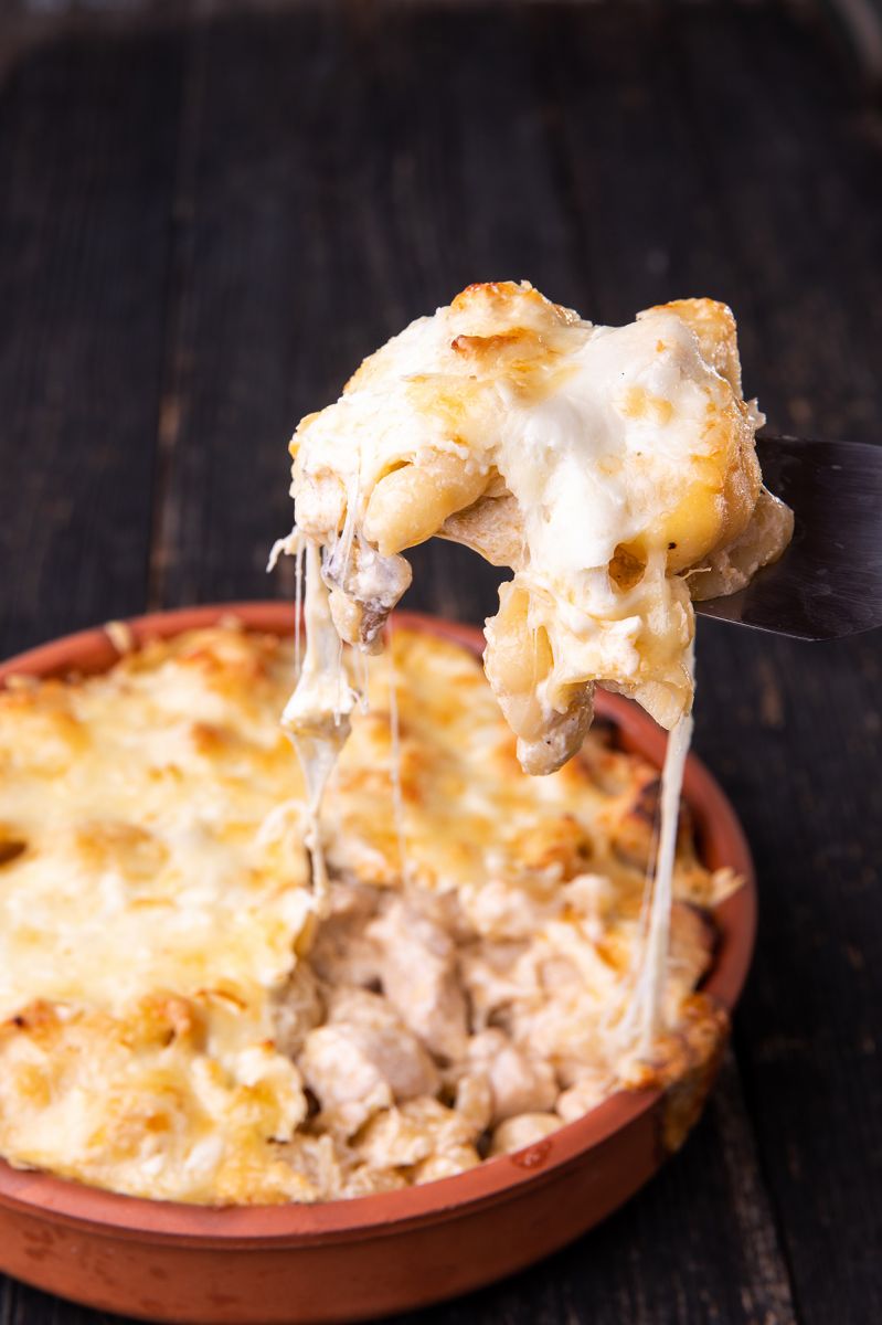 Amíg a csirke készül, bőséges vízben főzzük készre a laskát, szűrjük le és keverjük a kész csirkeraguhoz, majd az egészet töltsük egy cserépedénybe. A tetejét szórjuk meg reszelt sajttal, majd 180 fokosra előmelegített sütőben süssük addig, amíg a teteje aranybarna lesz. Miután kivettük a sütőből, hagyjuk pihenni 5-10 percet, majd tálaljuk.