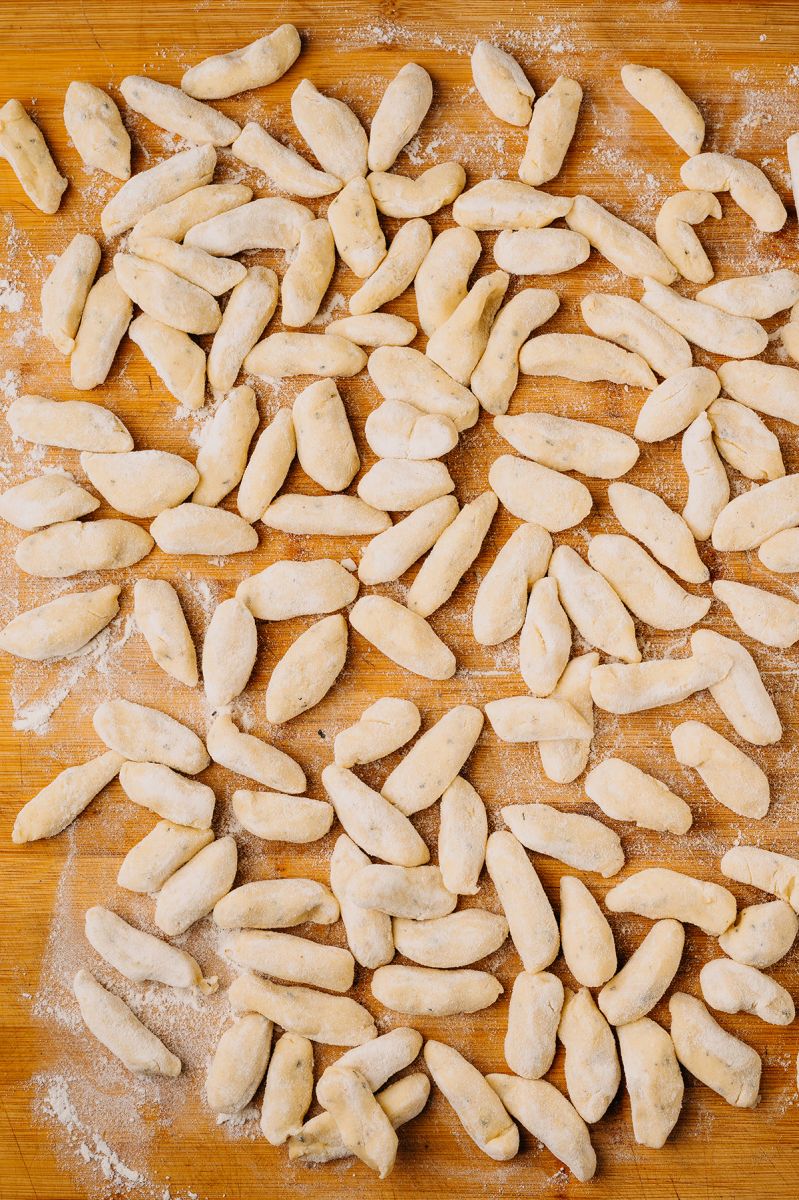 Ez egy nagyon egyszerű és tápláló étel. Első lépésként enyhén sós vízben főzzük meg a beáztatott babot. Amíg a bab fő, a nudlihoz a krumplit meghámozzuk, nagyobb darabokra vágjuk, és enyhén sós vízben megfőzzük. Amint kész, leszűrjük és hagyjuk egy kissé kihűlni. Ekkor krumplitörővel összetörjük, hozzákeverjük a tojást, majd fokozatosan a lisztet. Figyeljünk arra, hogy a krumpli inkább langyos legyen, mint meleg, így kevesebb lisztet vesz fel, ettől sokkal könnyebb, légiesebb lesz. Addig keverjük és gyúrjuk hozzá a lisztet, ameddig a tésztánk már nem ragad. Ekkor vágjuk kisebb darabokra, egy belisztezett sima felületen sirítsük henger alakúra az egyes darabokat, és egy meglisztezett késsel vágjunk belőle tetszés szerint kis nudlikat. A tenyerünkkel sodorjuk a nudlikat orsó alakúra. Amint végeztünk, rakjunk rendet magunk körül. A kész nudlikat enyhén sós vízben főzzük meg. Akkor vannak készen, amikor feljöttek a víz tetejére. Egy öntöttvas serpenyőben hevítsük fel az olajat, kissé pirítsuk meg benne a felszeletelt fokhagymát, csípős paprikát és a rozmaringágakat, majd öntsük hozzá a házi paradicsomlevet. Adjuk hozzá az előfőzött babot, és egy-két kanálnyit a bab főzőlevéből is. Enyhén sózzuk, borsozzuk és kellő állagúra sűrítsük be. Ekkor jöhet bele az előfőzött nudli. Forgassuk össze és parmezánforgáccsal, rozmaringcsipsszel meg egy kis extraszűz olívaolajjal meglocsolva tálaljuk.