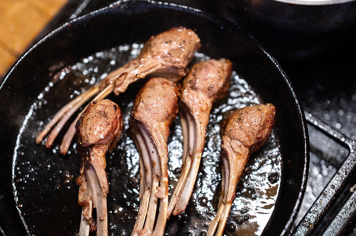 A csontos báránykarajt sózzuk, borsozzuk, majd a sertészsíron pirítsuk körbe egy öntöttvas serpenyőben. Ízletesebb lesz a hús, ha egy éjszakára 3%-os sóoldatba pácoljuk (1 liter víz, 30 g só), ebben az esetben sütéskor nem kell sózni, csak borsozni. Amint a sütéssel megvagyunk, tegyük félre pihenni legalább 5 percre. A báránykarajt médiumon kell fogyasztani, ellenkező esetben nagyon kiszárad. Aki jól átsütve szereti, süsse tovább a serpenyőben. A visszamaradt zsíron pirítsuk meg a felaprított fokhagymát, majd öntsük fel a borral. Párologtassuk el a bor nagy részét, majd adjuk hozzá a mustárt, a kakukkfüvet és a főzőtejszínt. Ízlés szerint fűszerezzük sóval, borssal. Főzzük addig, amíg kellő állagú nem lesz. A végén reszeljünk a szószba citromhéjat, és állítsuk be a savasságát ízlés szerint citromlével. A karajokat krumplipürével és mustáros szósszal tálaljuk.