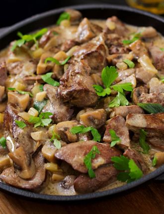 A hagymát megpucoljuk és kockára vágjuk; a gombát megtisztítjuk és felaprítjuk; a csirkemellet kockára vágjuk. A hagymát üvegesre dinszteljük az olajon, hozzáadjuk a csirkemellet, és fehéredésig pároljuk. Ekkor beletesszük a gombát, fűszerezzük sóval, borssal, pirospaprikával, és fedő alatt készre pároljuk. Ha megpuhult a hús, a lisztből kevés tejföllel meg frissen facsart citromlével habarást készítünk, és behabarjuk vele a paprikást. Párolt rizzsel tálaljuk.
